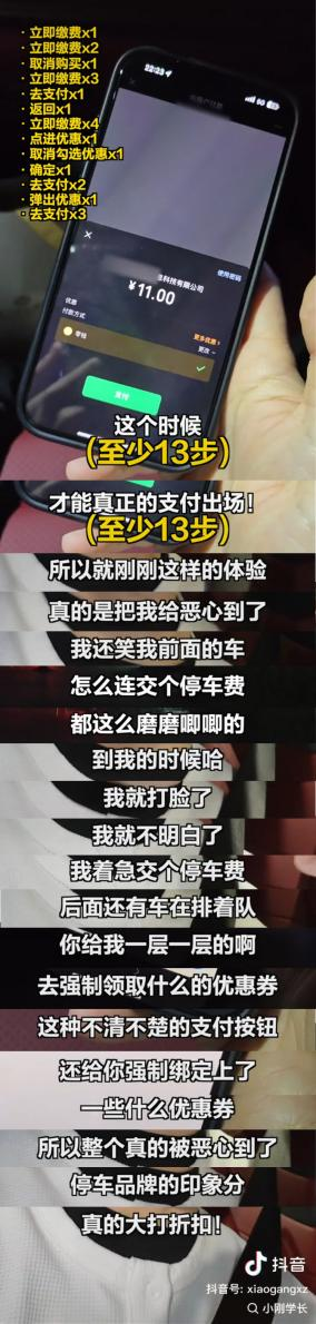 - 不少網友吐槽,自己在掃碼繳納停車費時體驗感不佳,明明輸入車牌號就可以付錢的小程序,卻還要和隨時彈出的廣告和所謂的“優惠活動”斗智斗勇。網友A就曾有過這樣的經歷:掃碼跳轉至繳費頁面,在“立即繳費x元”的下方,有一個白色框寫有“領取5元券本次停車可用”的字樣,點擊“確認”后,竟自動跳轉至廣告鏈接,上面提示,車主需要綁定支付寶并開通自動包月服務,才可領取到5元的停車抵用券。這樣一頓操作下來,全程下來需要花費大約5分鐘,且還不一定能成功領取抵用券。而網友B則是遇到過直接誘導消費的問題,停車兩小時,花費8元,但在繳費時出現了某某TV廣告鏈接,點進去后被扣了5元錢,工作人員告知費用是由第三方支付平臺扣除的,網友B只好吃了啞巴虧。類似以上這樣額外捆綁的行為頻頻發生,給用戶帶來了不必要的干擾和困擾。