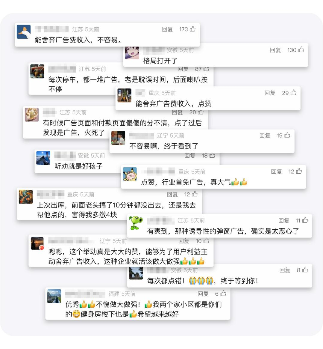 - 自速停車繳費純凈版上線以來,受到了眾多網友的贊揚與認可,“格局打開了”、“聽勸就是好孩子”、“能舍棄廣告收入不容易”、“行業首免廣告,大氣”......